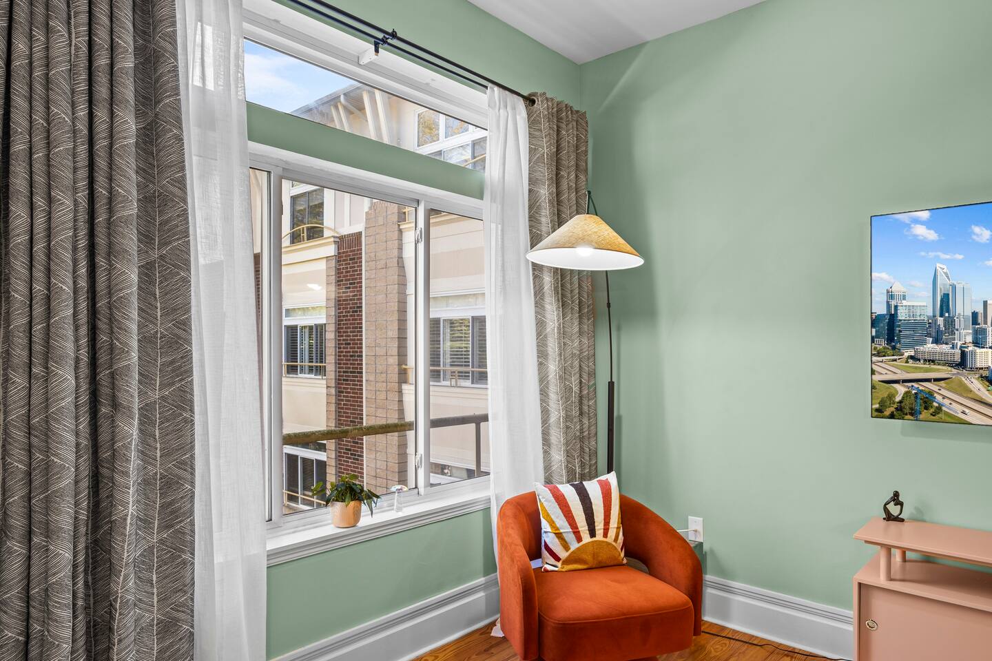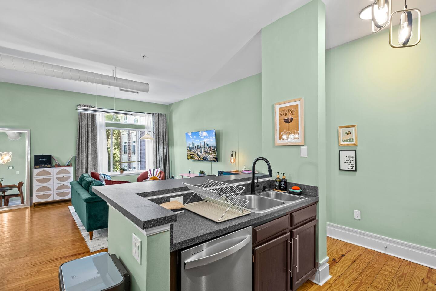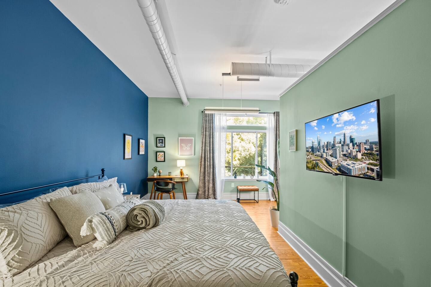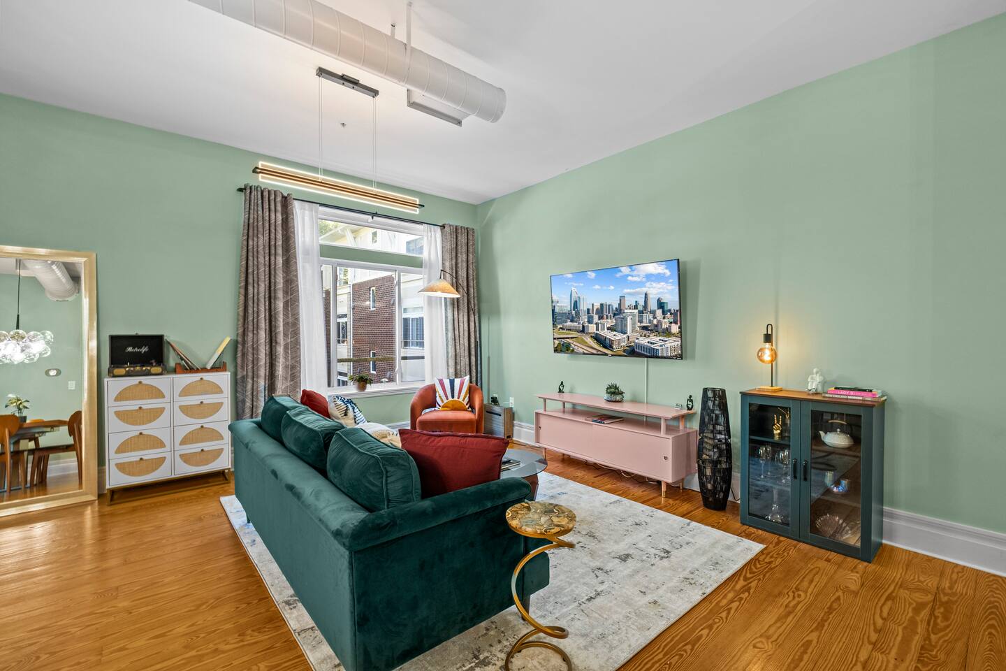 Discover a King sized cozy loft in Elizabeth! Open layout, 10ft ceilings, pine wood floors. Kitchen with a coffee bar, new stainless steel appliances. Spacious living area, dining space. Bedroom with privacy wall, large walk-in closet. Updated bathroom, new sink, shower head. Secure building with elevator, gated parking, outdoor patio. Free live television and internet! Prime location, walk to Elizabeth/Plaza Midwood shops, restaurants, wine bars. Short drive to Uptown. 7 day minimum booking.