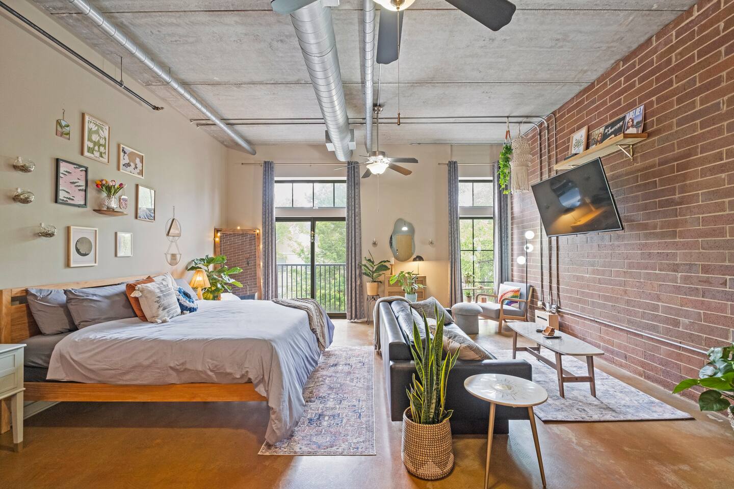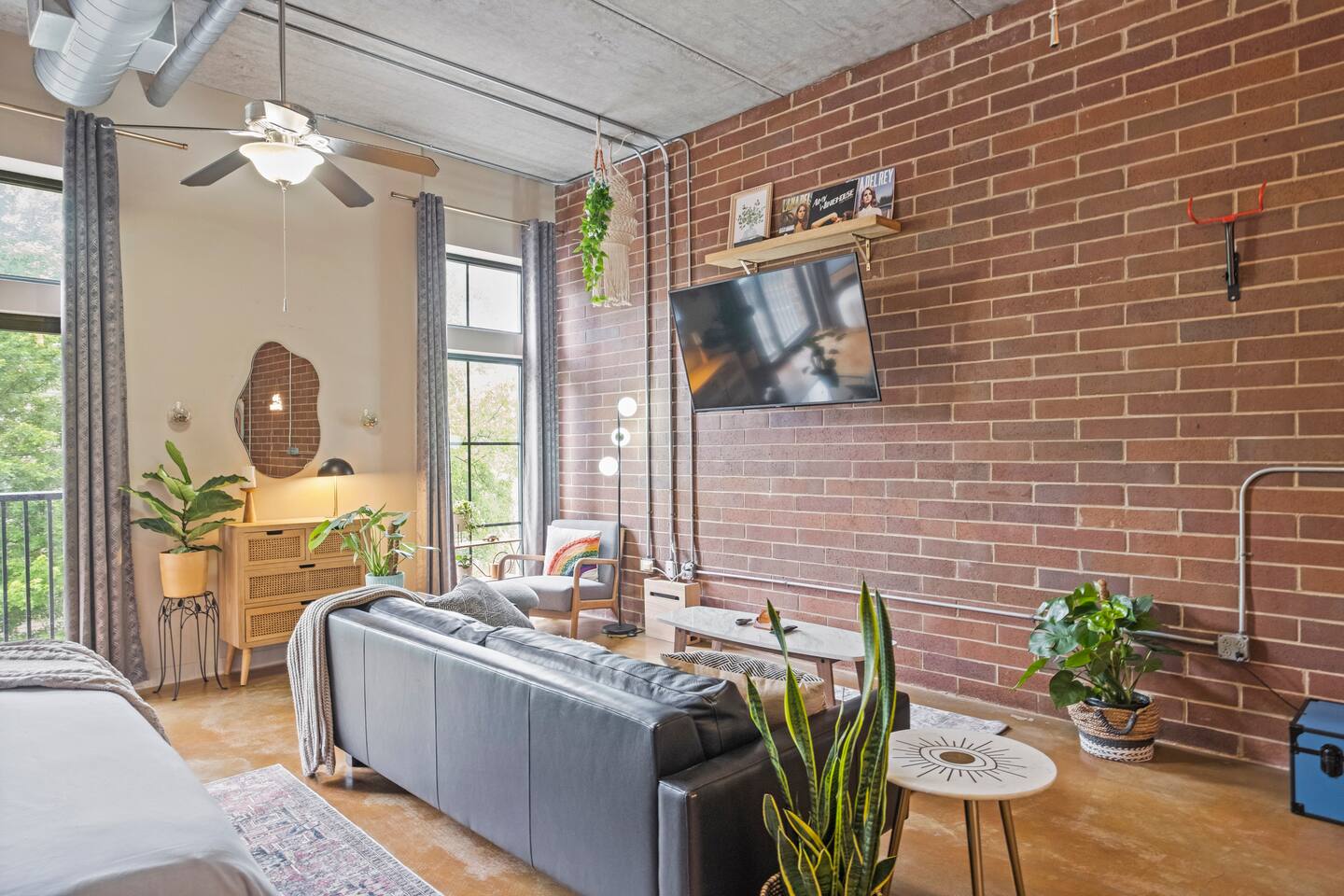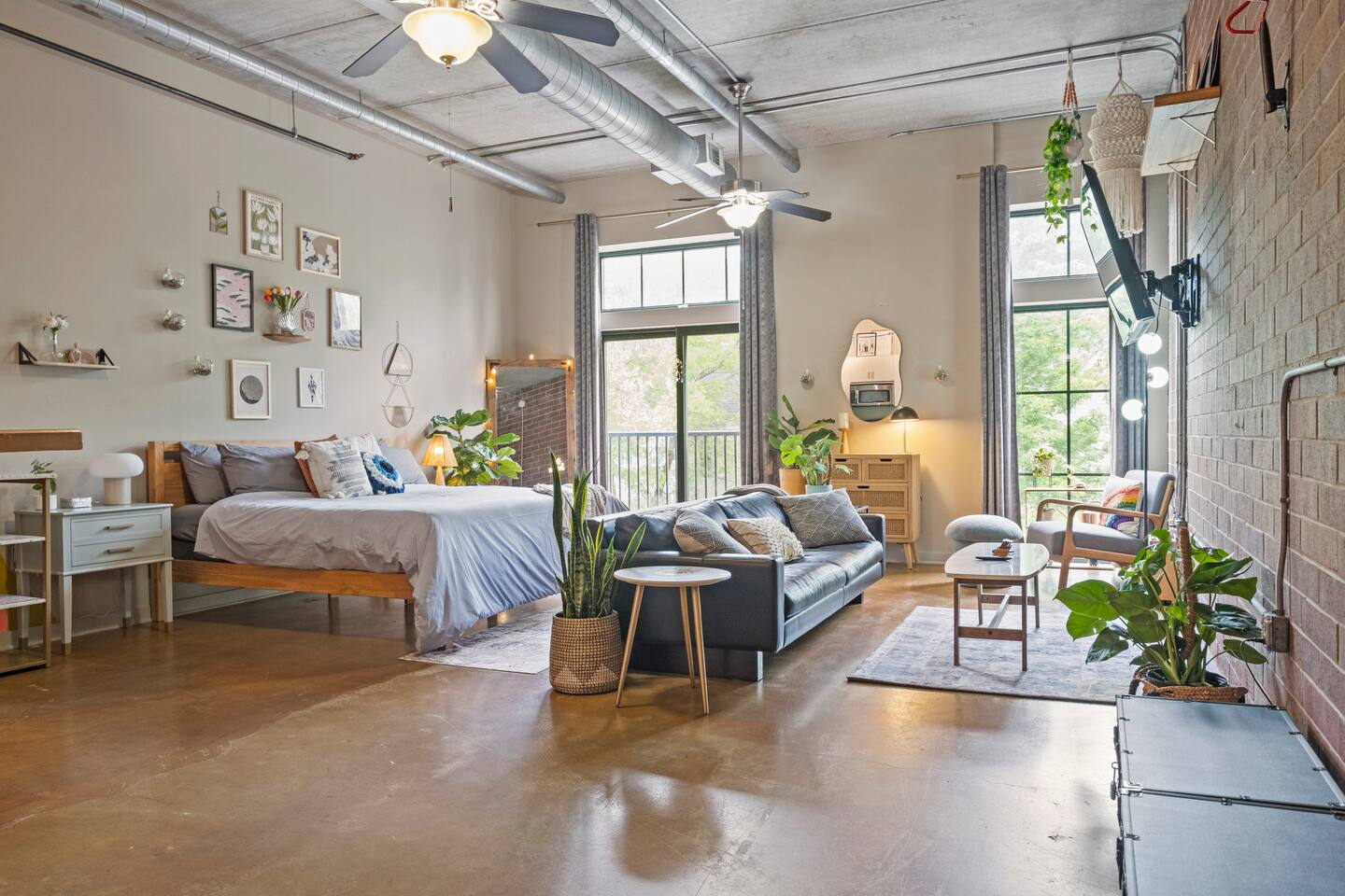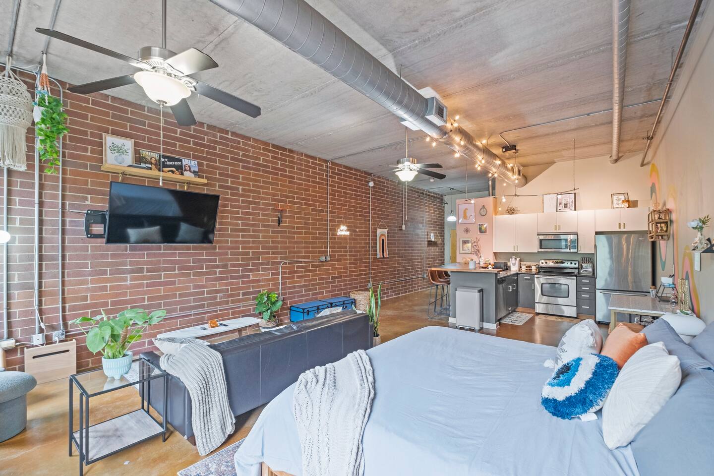 *Strict non-smoking policy* Enjoy a fun experience at this king studio in uptown Charlotte! High-speed internet & free live television on a huge screen! The unique exposed brick, high ceilings and concrete floors give the space a chic industrial feel, while the decor balances a warm homey vibe. Perfect location for exploring uptown Charlotte! Ideal for couples or solo travelers. 2 min drive/19 min WALK to Panthers Stadium 3 min drive/18 min WALK to Spectrum Center. 7 day minimum booking.