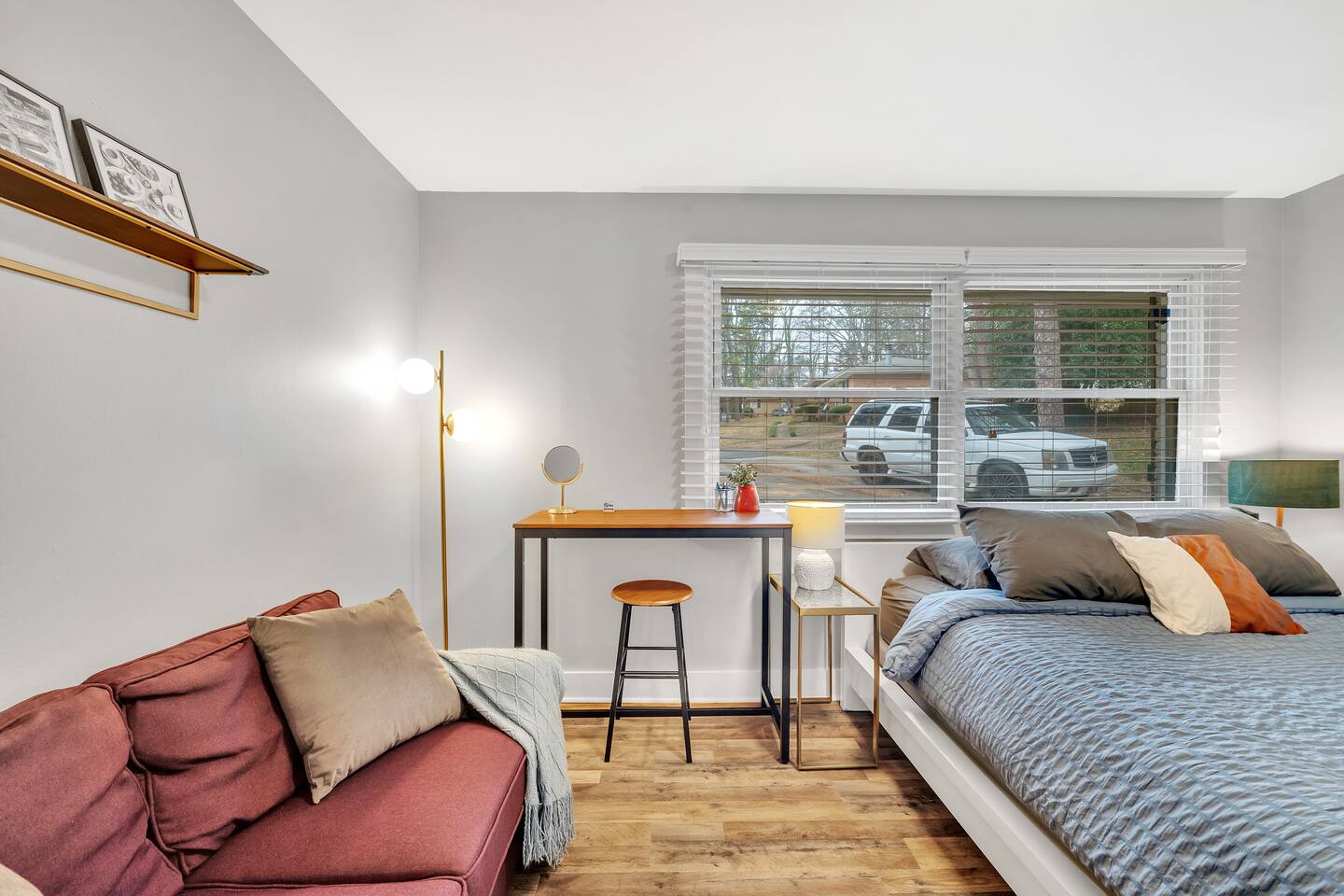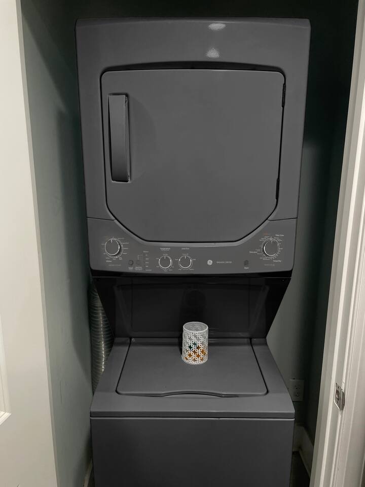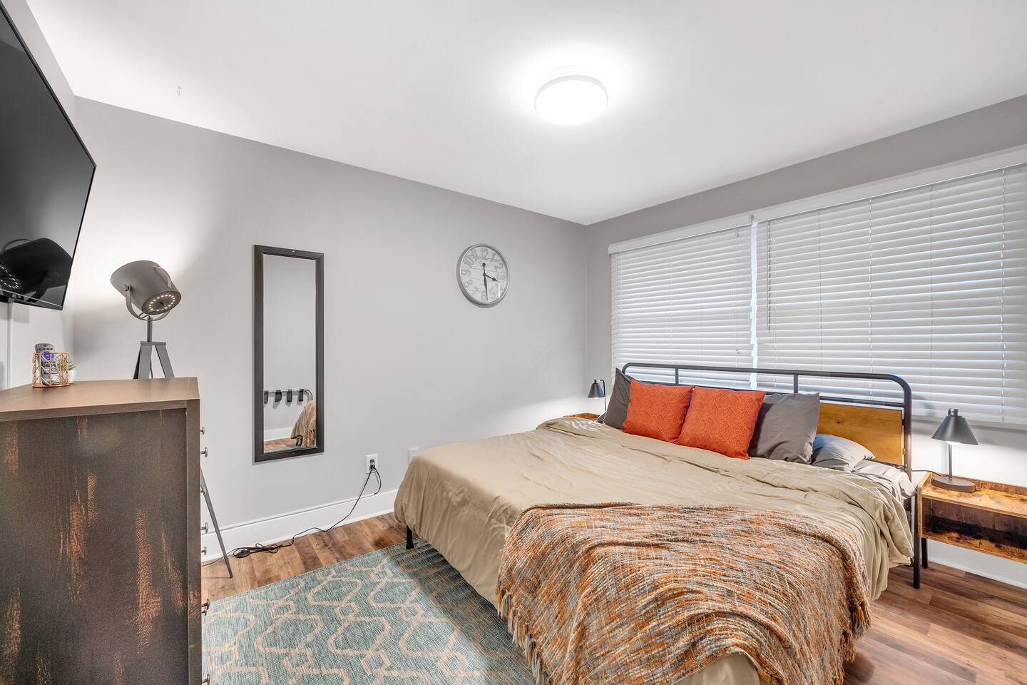 This 2 bedroom, 1 bathroom space is designed to feel like home away from home whether it's a short-term or longer-term stay. It features a king sized bed, walk-in closet, and tv. In the secondary bedroom you'll find a queen bed and office workspace. The living room has a smart television that comes equipped with premium Youtube TV for those who would like to access to live sports, news, and staying up to date with their favorite TV shows! The full-sized kitchen comes equipped with everything from a coffee station to help get your mornings started, and plenty of basic necessities to cook from home. Included is a washer and dryer that you are welcome to use!